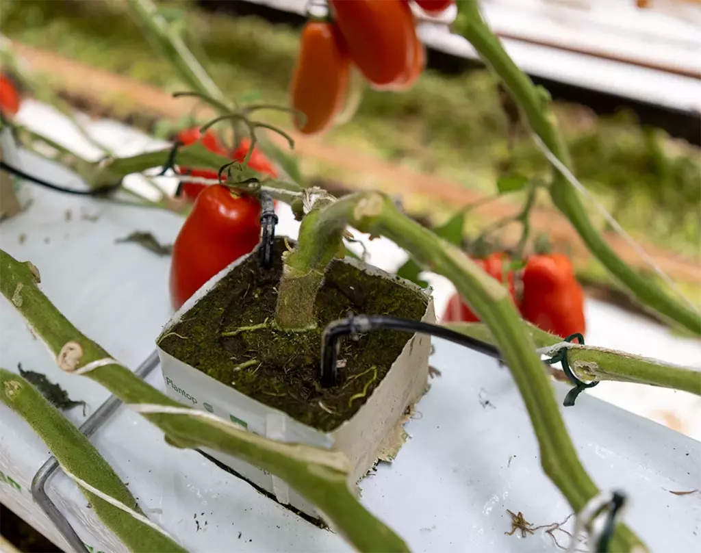 La tecnica idroponica consente di coltivare senza l’ausilio del terreno sostituito da un materiale inerte in cui si sviluppano le radici dei pomodori, irrigate con una soluzione bilanciata di sali minerali necessari per la loro crescita. Tutto questo in un sistema a ciclo chiuso, dove ogni goccia d’acqua viene recuperata e rimessa nel sistema permettendo un notevole risparmio idrico. Le serre con la loro specifica struttura permettono un attento controllo del clima proteggendo le colture da fattori esterni limitanti la qualità e salubrità dei pomodori.